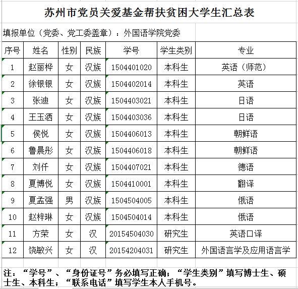 苏州市党员关爱基金帮扶贫困大学生汇总表