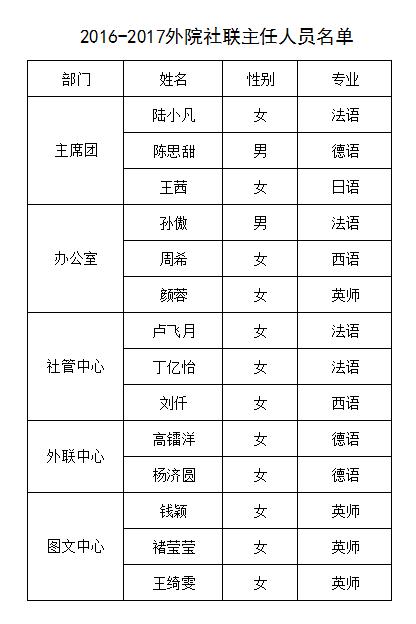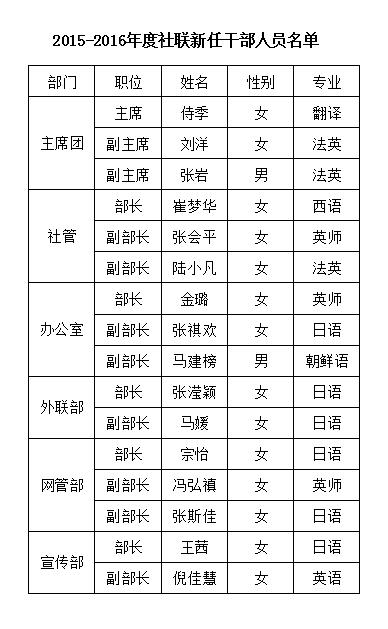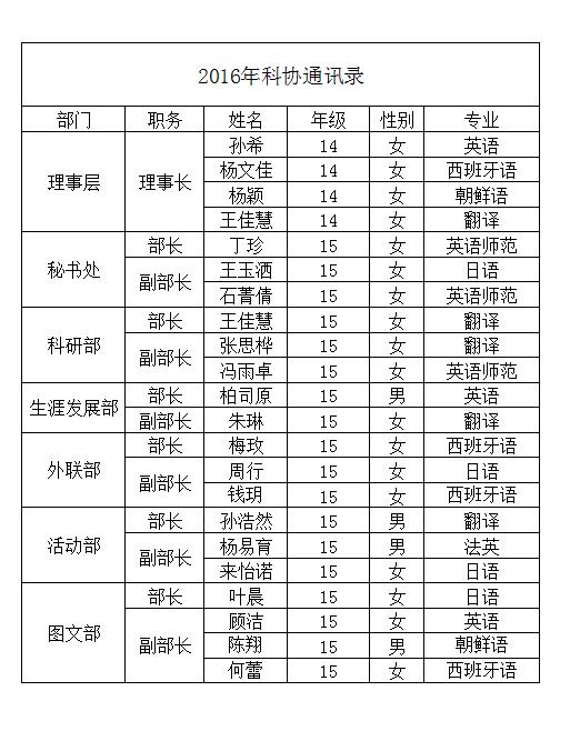 2016科协名单 理事长:孙希 杨文佳 杨颖 王佳慧 秘书处部长:丁珍 石菁倩秘
