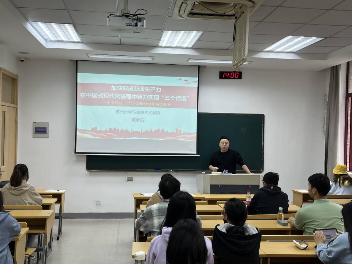 戴老师详细地介绍了新质生产力的理论内涵、主要特征、核心要素等。新质生产力是创新起主导作用,摆脱传统经济增长方式,生产力发展路径,具有高科技、高效能、高质量特征,符合新发展理念的先进生产力质态,由技术性革命性突破、生产要素创新性配置、产业深度转型升级而催生。戴老师将理论与具体事例相结合来帮助同学更清晰深入地理解此概念。山东日照港在传统码头的基础上,通过科技攻关建成了全自动化集装箱码头,大大节省了人力和财力。该港口的自动化和数字化位于世界前列,在加快构建新质生产力、实现高水平科技自立自强的道路上迈出新步伐。戴老师还以苏州的苏绣小镇为例来展示传统手工艺产业如何焕发新活力,发展新质生产力,推动高质量发展。苏绣小镇不仅仅致力于精美的刺绣作品制作,还在“苏绣+动漫”“苏绣+游戏”“苏绣+影视”等产业跨界融合发展方面取得了成功经验,通过版权赋能让这门传统工艺更好地在新时代绽放了文化魅力。