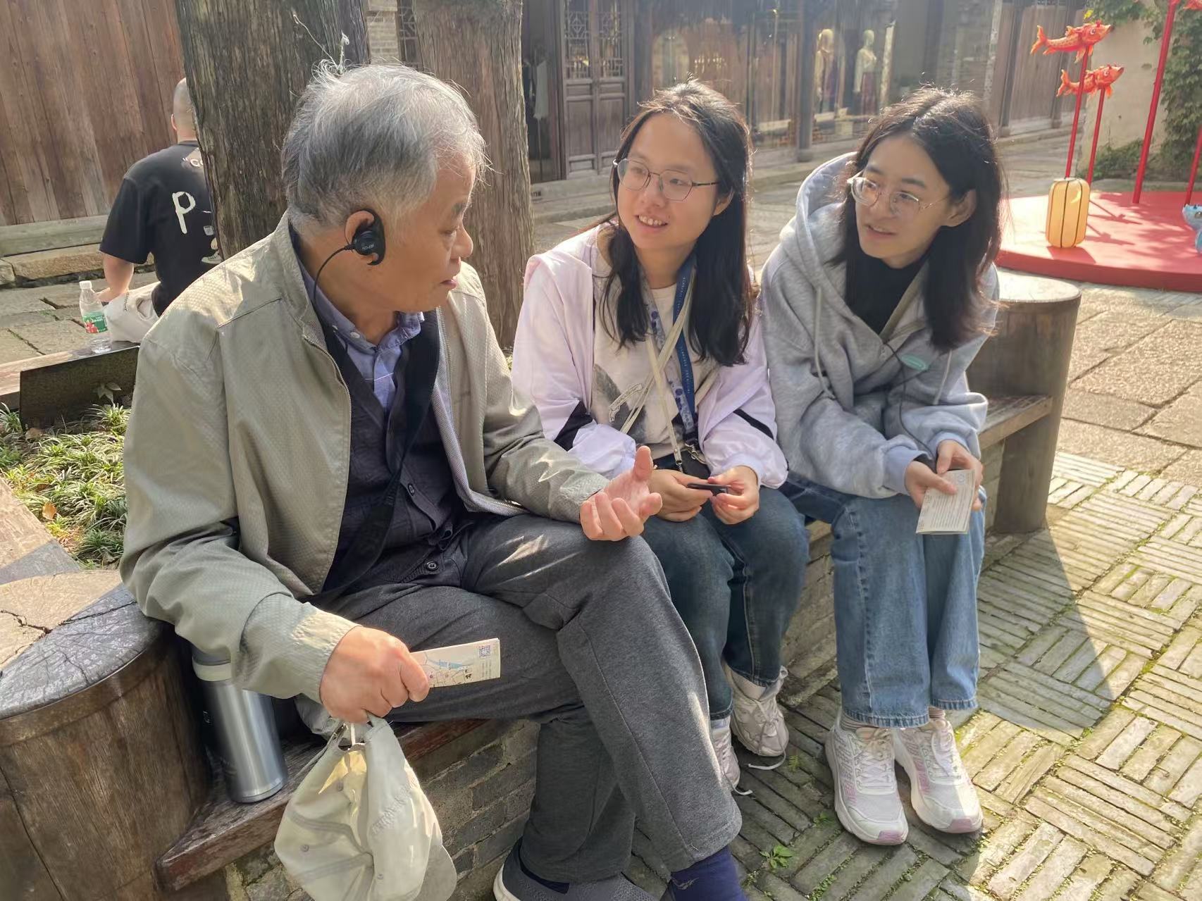 在濮院,本科生翻译专业青年党员孙莹瑛和吴奕琳与徐青根老院长就当前翻译热点领域如游戏本土化翻译进行了交流,徐院长表示翻译万变不离其宗,无论是游戏翻译,还是小说翻译,都需要根据目的语受众灵活调整翻译策略。两位青年党员受益匪浅。