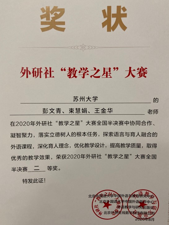 2020年日本色情片 彭文青、束慧娟、王金华三位老师组成团队参加了外研社“教学之星”大赛,获得了全国半决赛二等奖,团队成员排名不分先后。