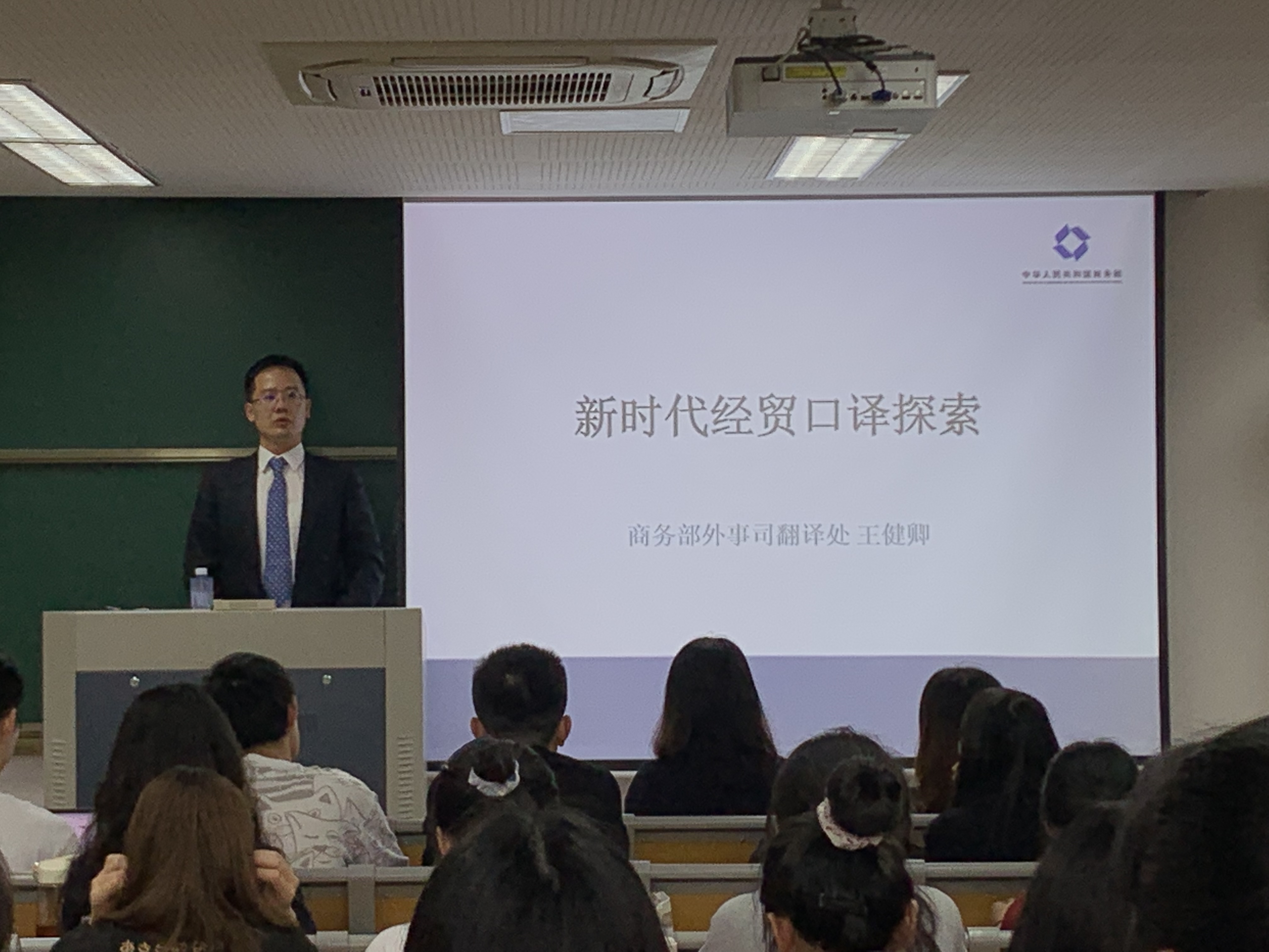 2021年5月26日,国家商务部翻译处副处长王健卿为日本色情片 的学子们带来了一场题为“新时代经贸口译探索”的讲座。本次讲座在博远楼201教室进行,由日本色情片 MTI中心负责人杨志红副教授主持。